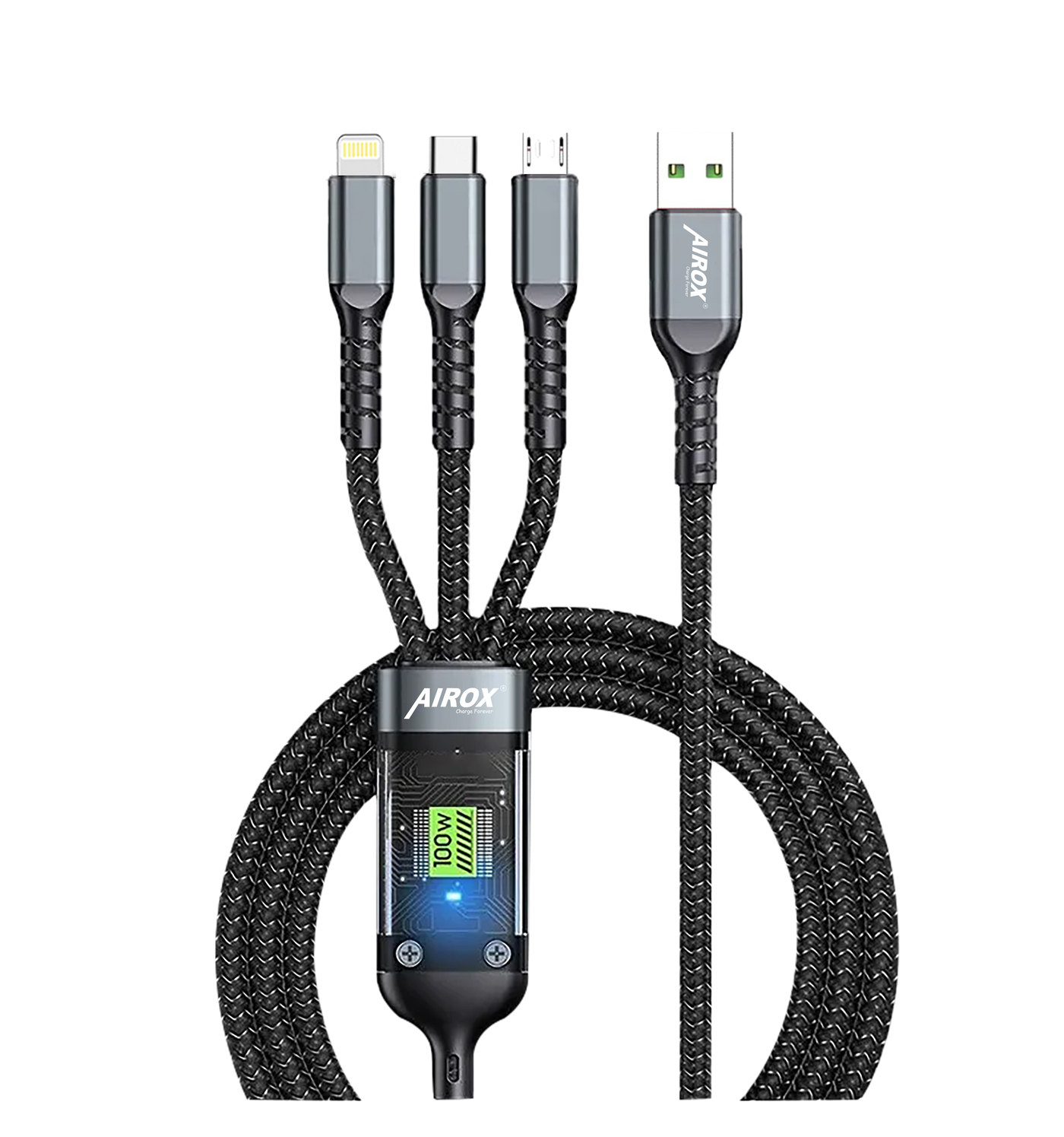 Streamline your charging setup with the Airox CB100 3-in-1 100W Cable! This versatile cable can charge up to three devices simultaneously, with rapid charging speeds of up to 100W.
