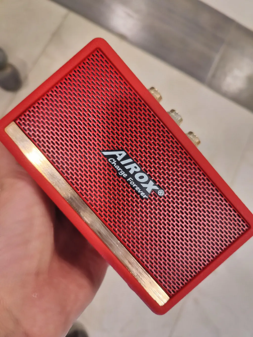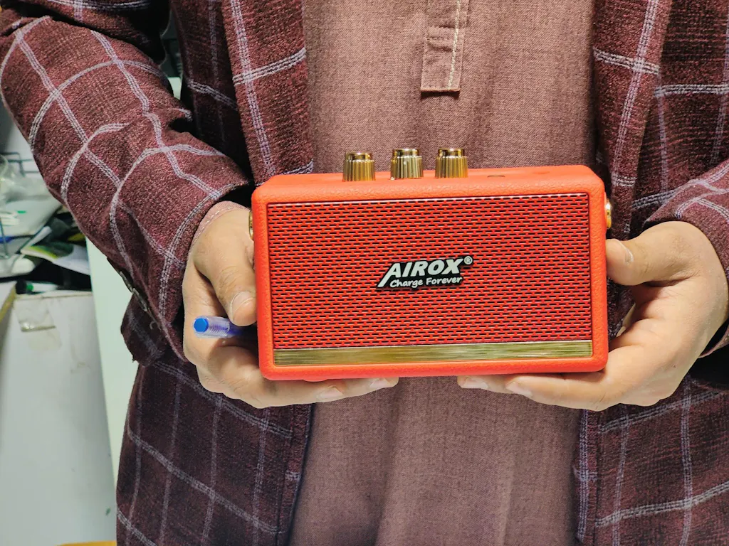 Experience the perfect blend of vintage aesthetics and modern audio performance with the Airox SP-12 Portable Speaker. Designed for music lovers who appreciate style, this speaker features a striking red leather-textured finish with premium gold accents, making it a standout accessory for any room or outdoor adventure.